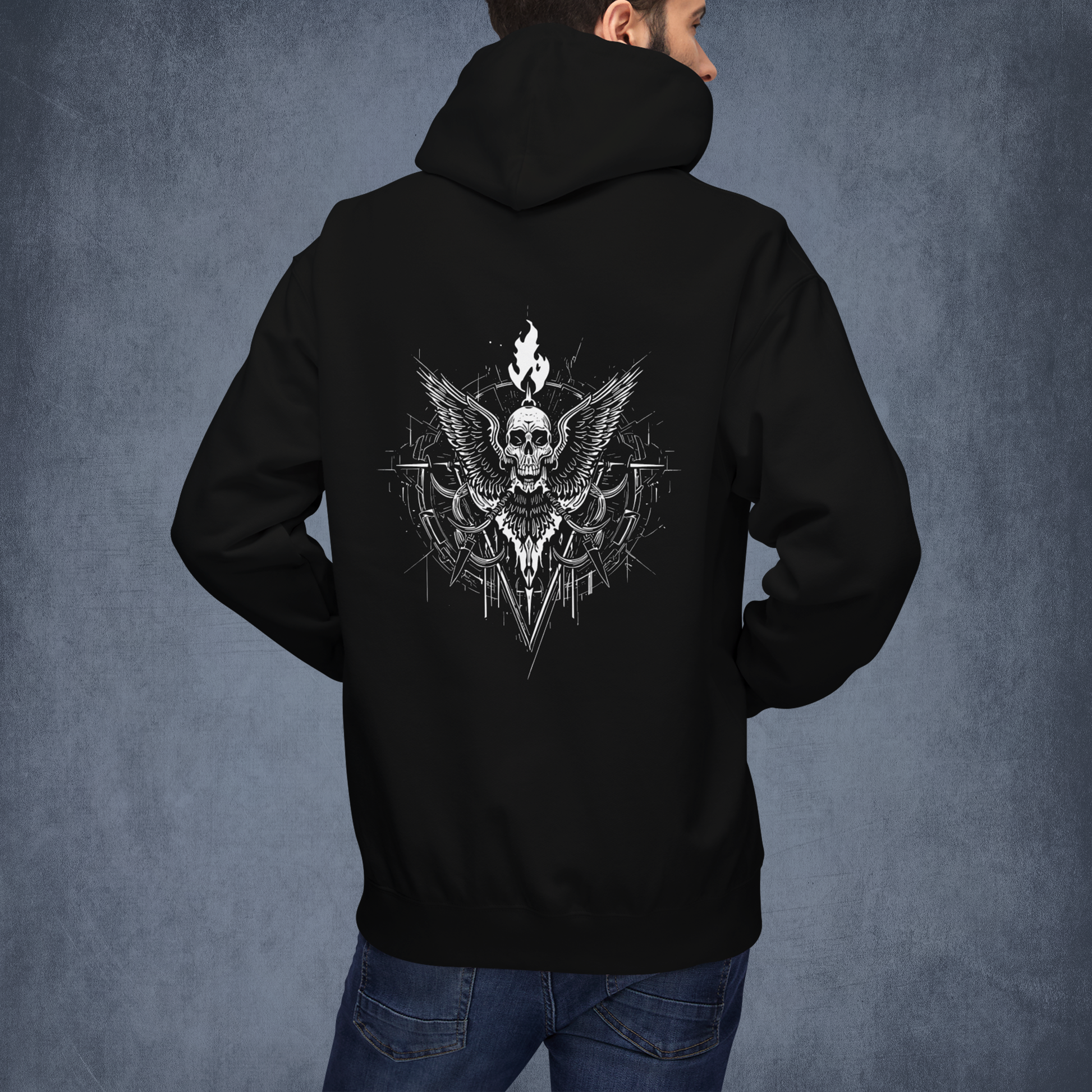 This hoodie lets you wear your creed on the front, while the back carries a fierce winged skull engulfed in fire and steel — a symbol of rebellion, strength, and survival.